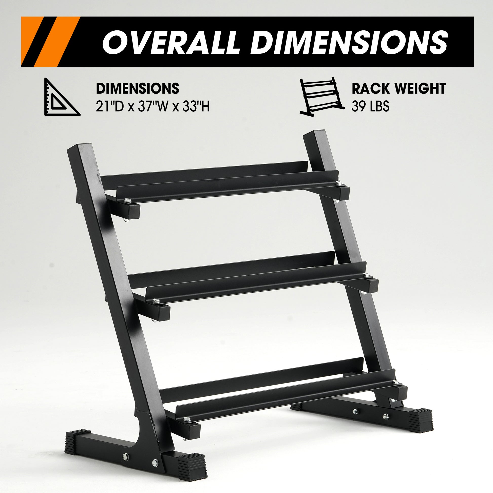 This Mikolo 3-tier dumbbell rack measurs 21” x 37” x 33”. The triangle frame with welded reinforcement and dual screw fixation, provides great stability. The 10-degree slanted shelves allow for easy loading and unloading, while keeping all dumbbells securely in place.