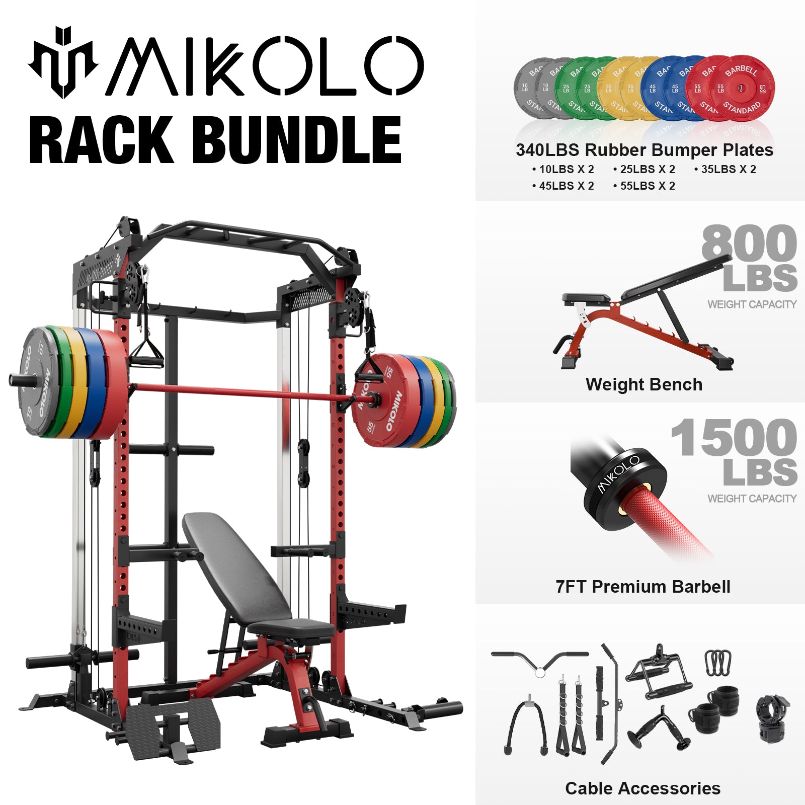 In addition to the workout that regular power cage and squat rack can provide, HR05's unique dual-pulley system cable crossover design allows you to complete super set, drop set, co-training and other gym workouts without being limited by the home gym weight stack cap.With 30 height options, whether it's a more applicable starting position, a safer limiter setting, or accommodating a wider variety of heights, it's a better choice. The rack equipped with more weight storage areas not only adequately accommodate larger weights, but also further enhance overall stability.Constructed from 2x2-inch commercial steel tubing for added stability and robust construction. Assembled dimensions: 61''(L) x 53.4''(W) x 86''(H). Gross Weight: 205 lbs. The machine boasts a maximum capacity of up to 2000 lbs.The HR05 comes with all the attachments you may need more of in your daily training. including 4 free handle attachments, 2 safety spotter pins, dip bars, j hooks, and T-bar row attachment. This provides a wide range of exercises, such as wide & narrow lat pull-downs, T-bar rows, seated cable rows, bench presses, squats, deadlifts, bicep curls, triceps extensions, pull-ups, chin-ups, dips, and more.Enjoy seamless and stable workouts with the upgraded pulley system. The improved sliding sleeves ensure smooth operation while protecting it from wear and tear. This upgrade not only enhances your workout experience but also extends the lifespan of the power rack, making Mikolo a smart long-term investment for your home gym.