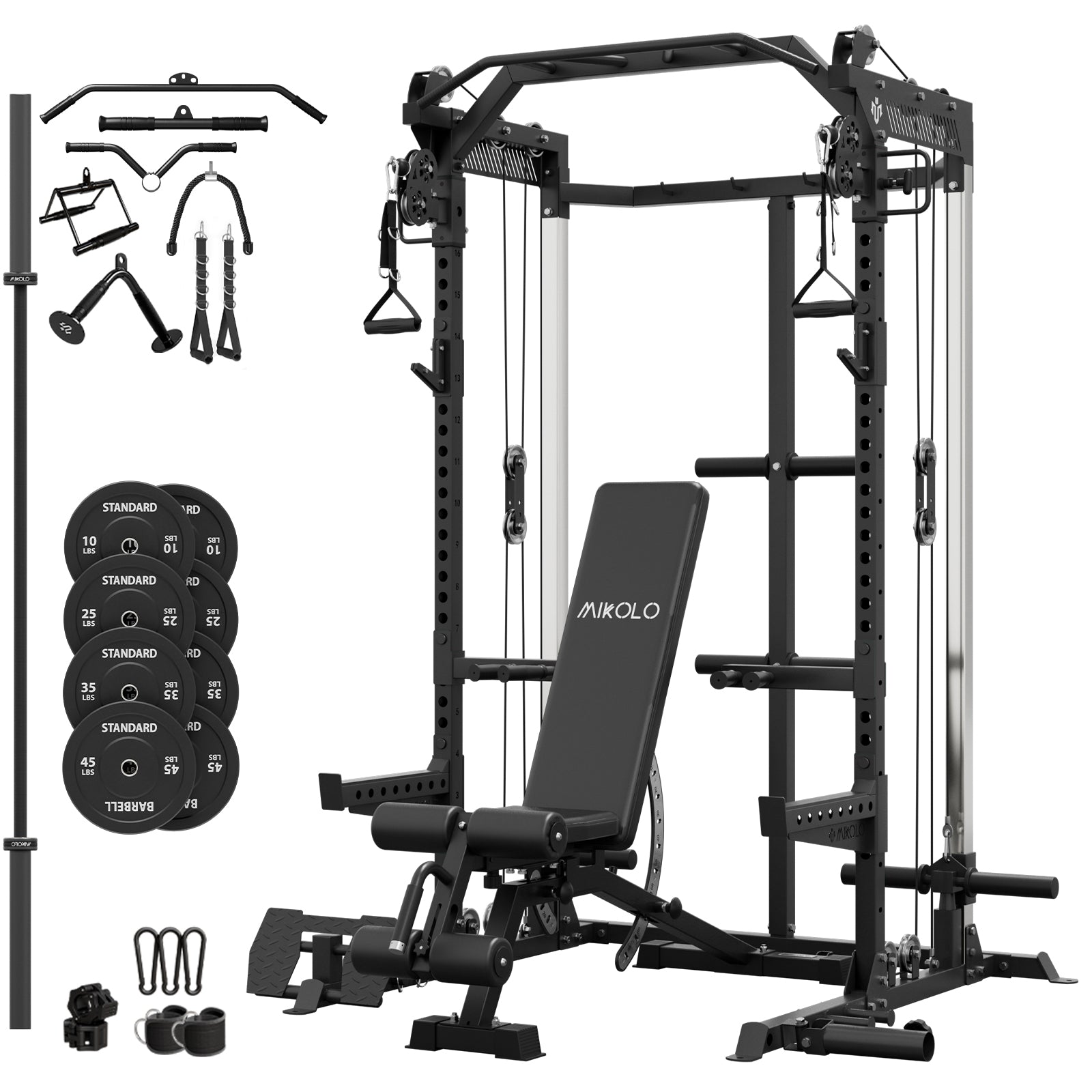 Mikolo Power Cage, Squat Rack With Dual Pulley Cable Crossover System, Multifunction Free Weight Home Gym Workout Machine With Attachments Set(B230B)