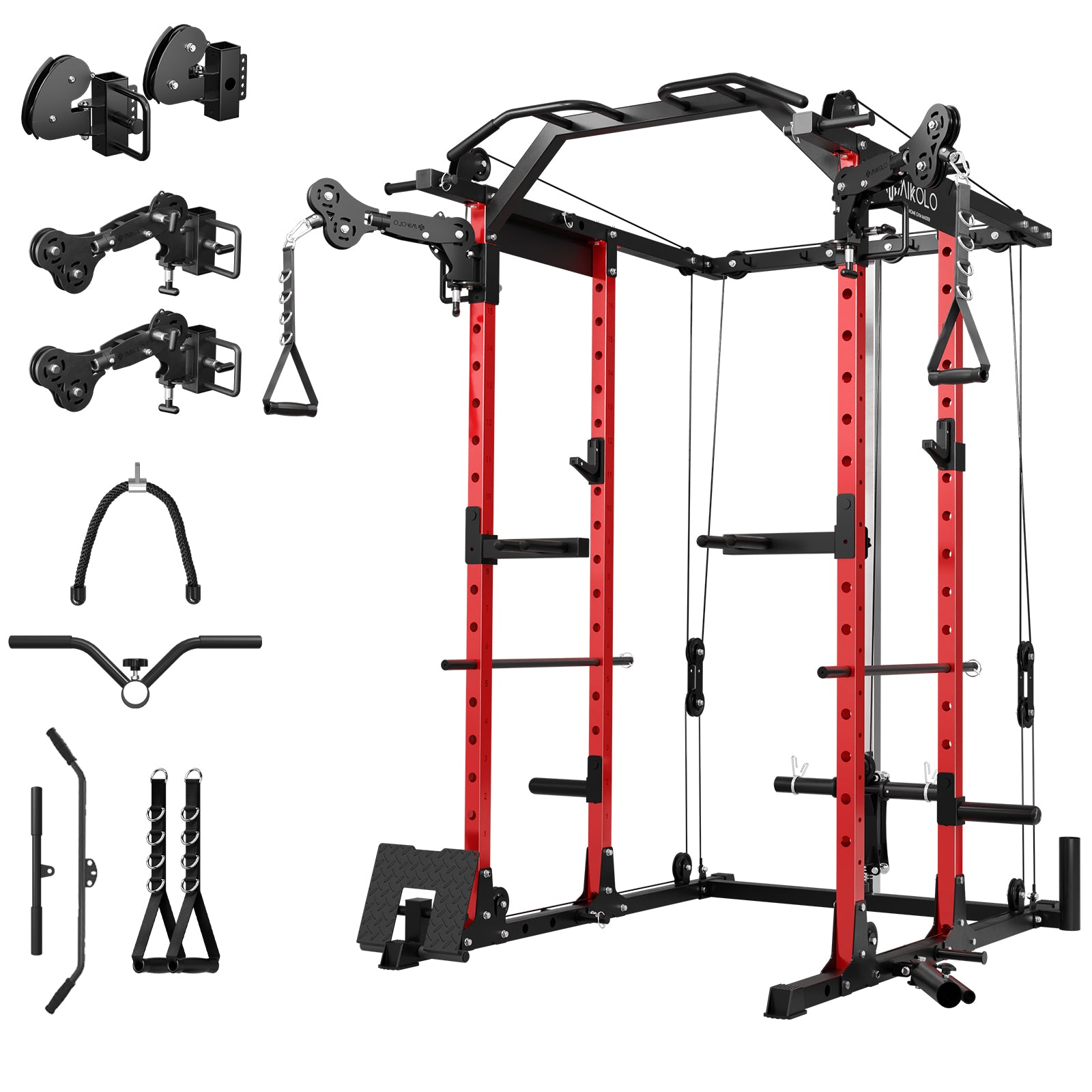 Mikolo Power Rack Cage, 1500 lbs Weight Rack with Cable Crossover Machine, Multi-Function Squat Rack with J Hooks, Dip Bars and Landmine for Home Gym (Red) Functional Trainer Arm