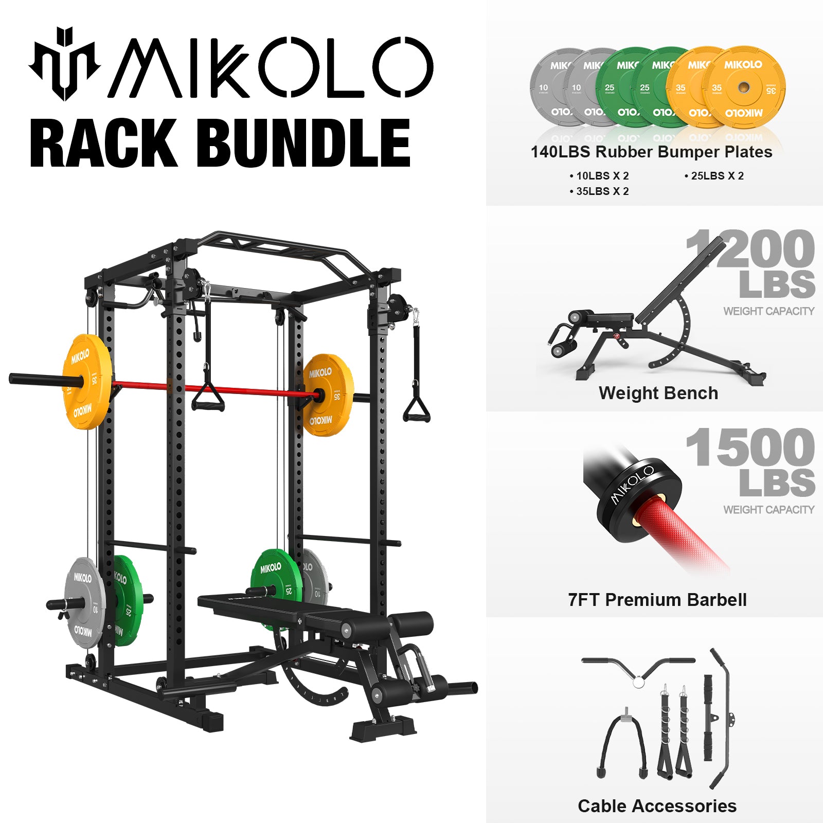Mikolo Power Rack Cage with Dual Pulley System, 800lbs Adjustable Weight Bench, 1500lbs Barbell Bar and 140lbs Weight Plates for Home Gym Workout