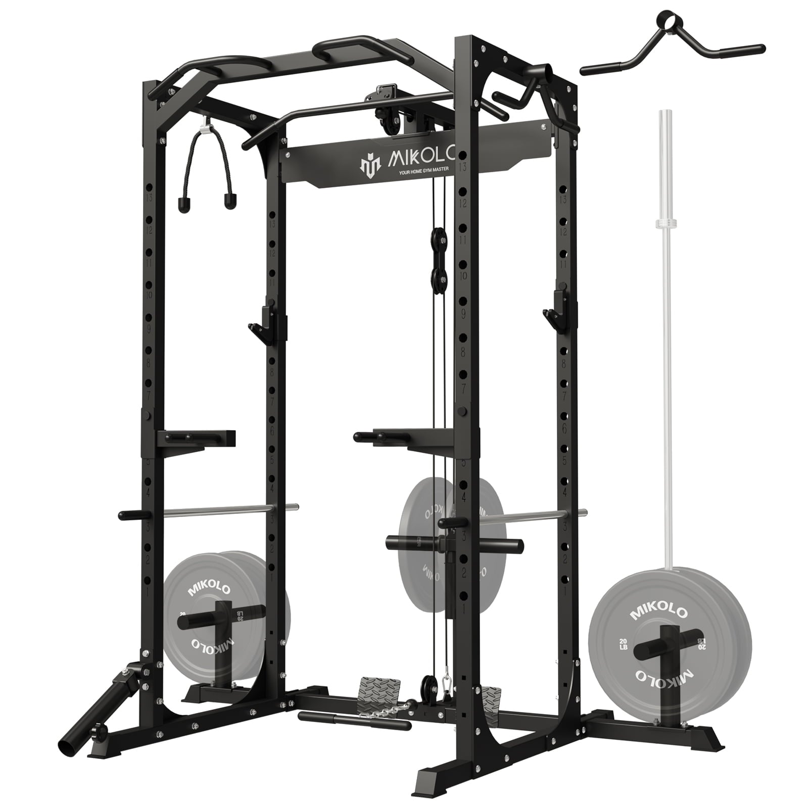 Mikolo Power Rack Cage with LAT Pulldown System, 1200LBS Capacity Power Rack, Multi-Functional Squat Rack with 13-Level Adjustable Height and J-Hooks, Dip Bars, T-Bar, Squat Cage(Upgraded)