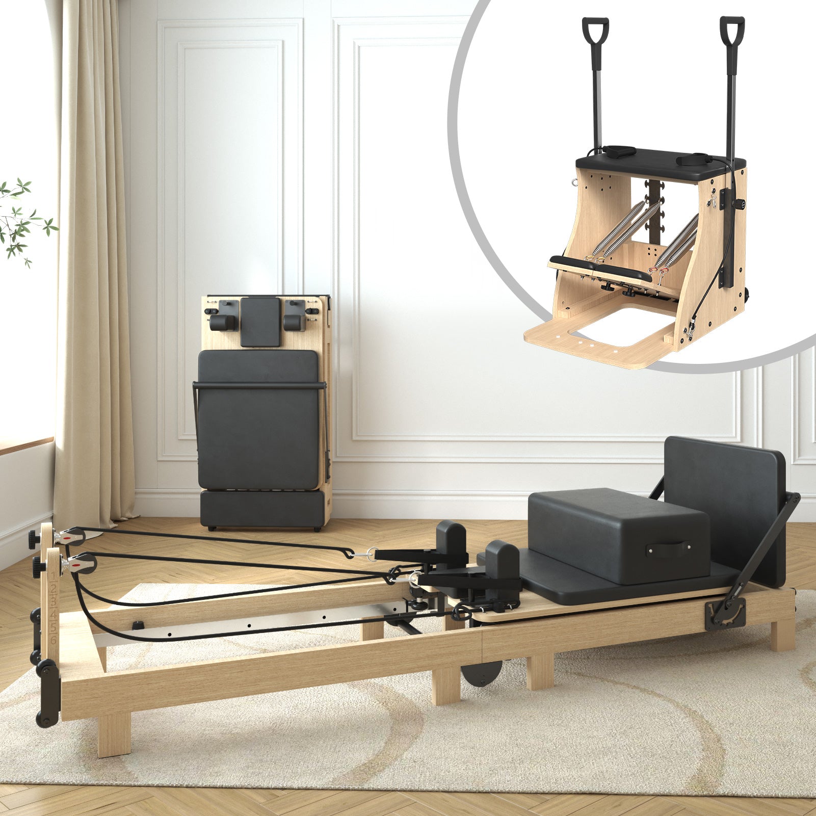 Syedee Pilates Reformer Machine, Wood Pilates Machine Bed Yoga Exercise Strength Training Equipment with Pilates Chair for Home Workout